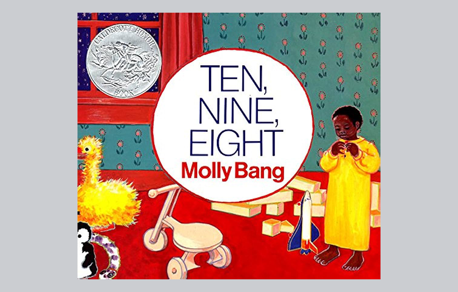 In this Caldecott Honor board book, a young girl sits on her Daddy’s lap and together they count the things they see in her room at bedtime. You and your baby can count backwards from 10 to 1, beginning with the little girl’s toes. As you open the book, the text is on the left side on a white background with the number first, enlarged and in a bold color. You will find illustrations in dark red tones on the right-side page for you and your baby to explore together.